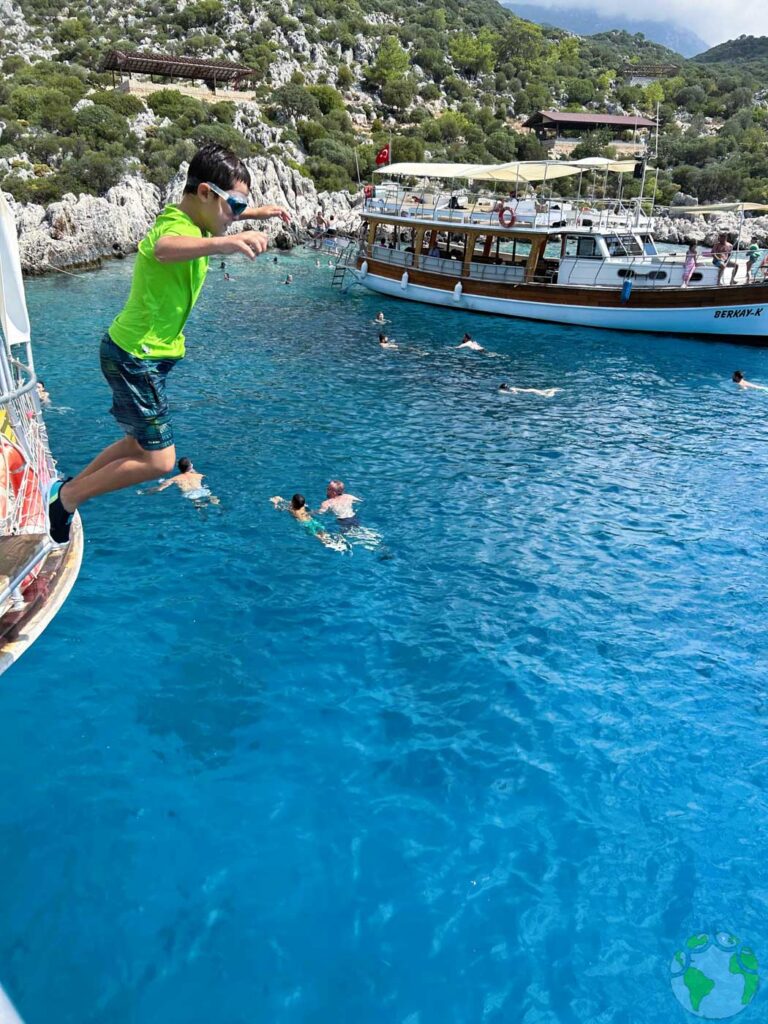 Durante la excursión se realizan varias paradas para jugar y nadar, tirándose desde trampolines del barco o simplemente para refrescarse en el agua. Se visitan pequeñas bahías como Tersane Koyu, donde hay restos de un antiguo astillero y también otros rincones muy chulos donde el barco fondea para que puedas nadar.