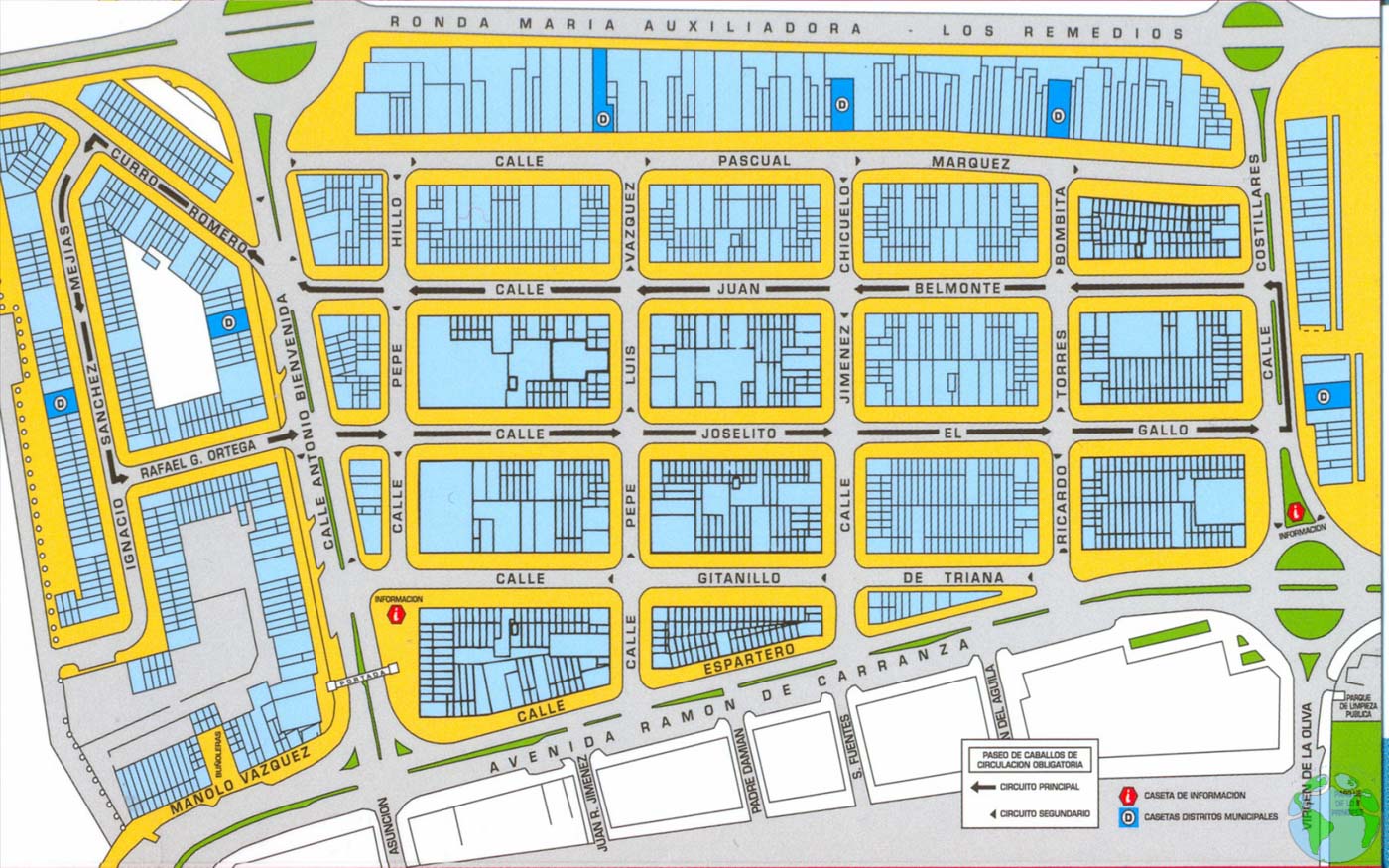 • El Real, compuesto por 15 calles con nombres de toreros famosos y en las que se ubican las casetas.
